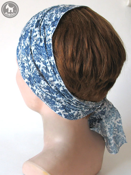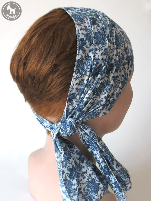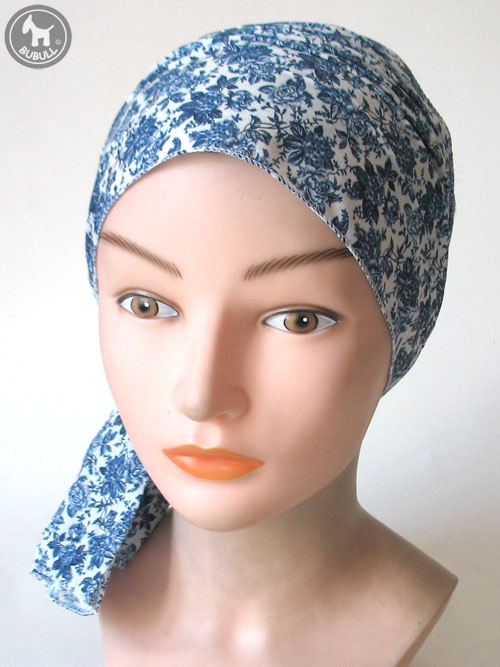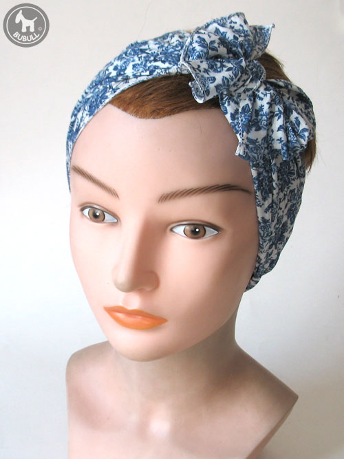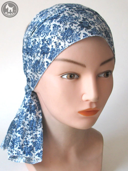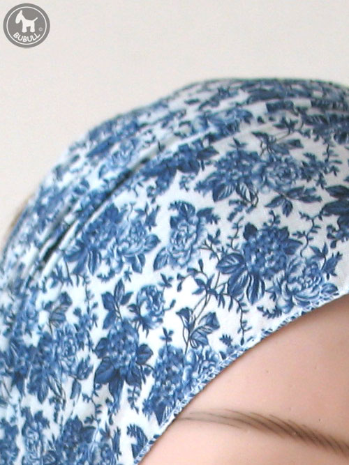 Bandeau bleu Bandeau blanc cassé ,bleu à fleurs Fin en voile de coton Peut se porter seul ou sur un bonnet ou beret jersey Taille unique PIECE UNIQUE coupe très ac..