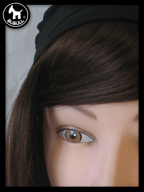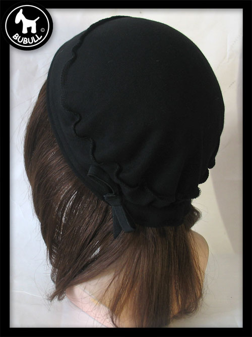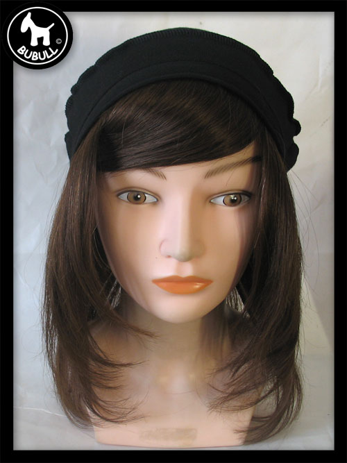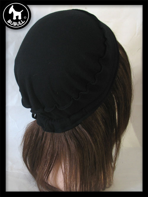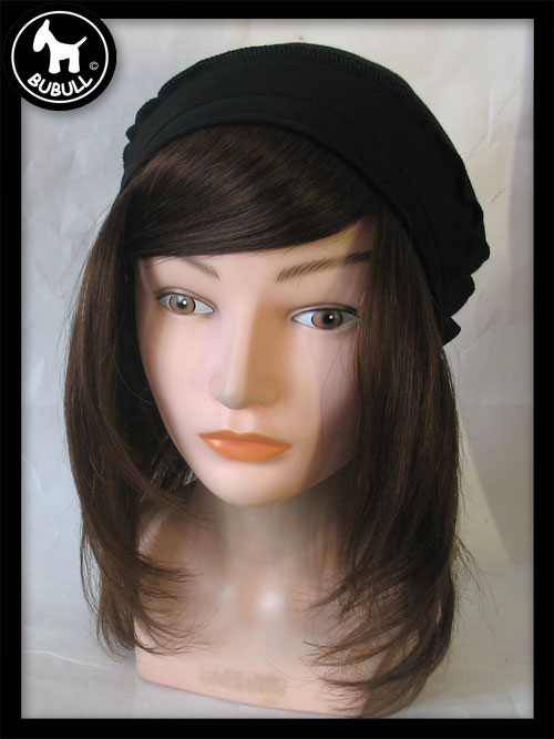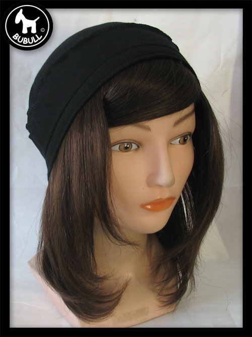 Cheveux chatain naturels fixés sur un bonnet en coton jersey noir.