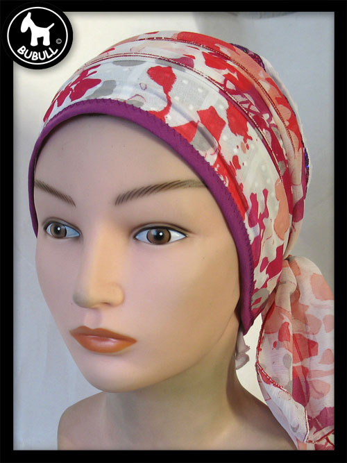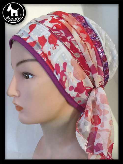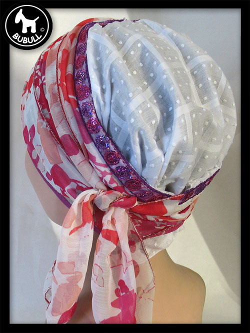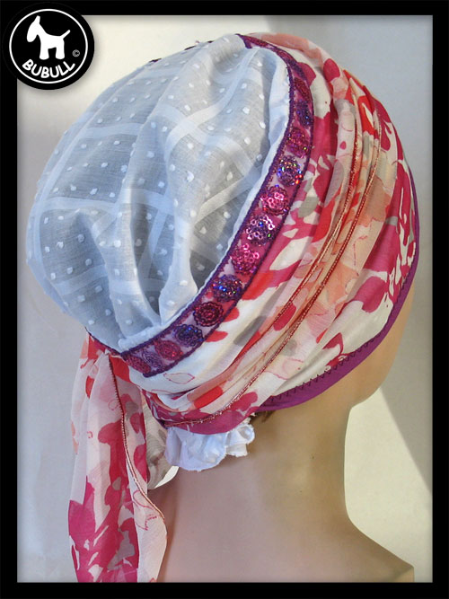 Très beau foulard blanc et couleur, base en coton fin et turban synthétique avec un ruban en décoration.