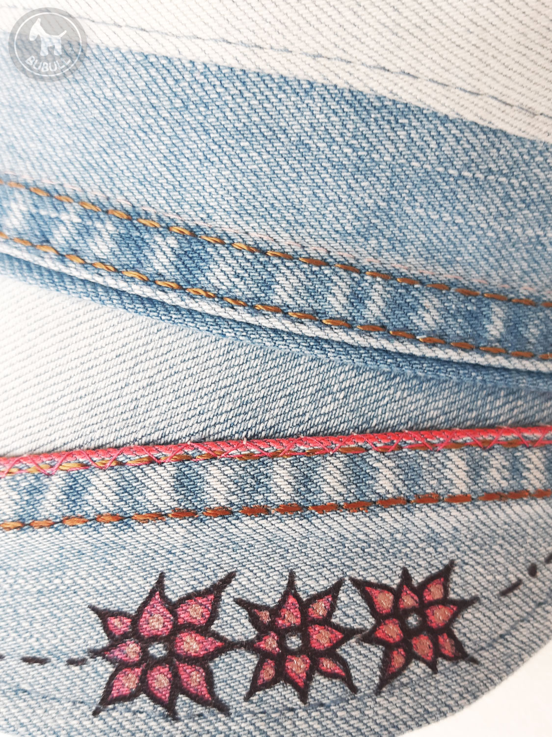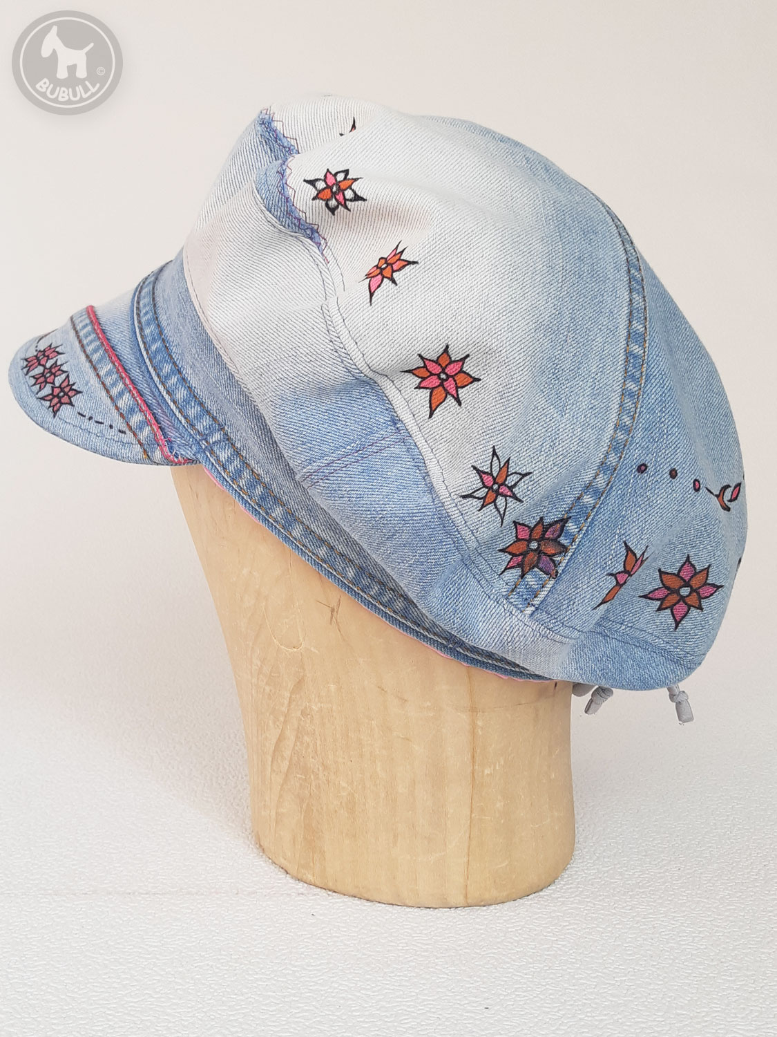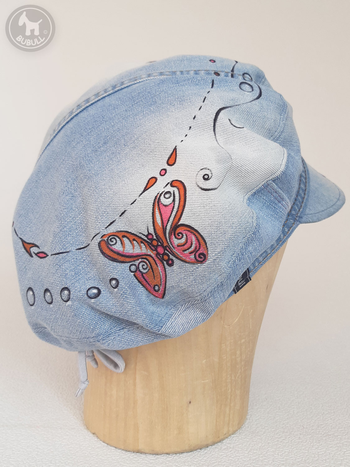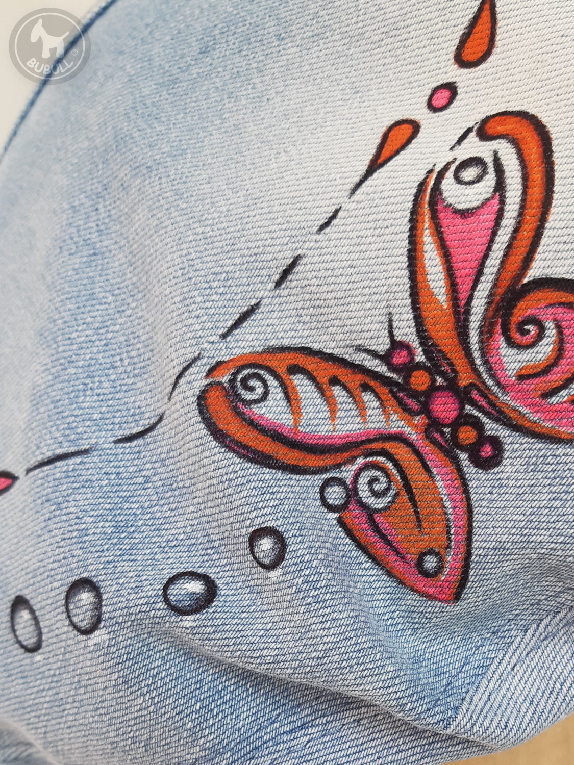 -Du jeans(recyclé) bleu clair,avec papillon,fleurs et décorations,peintes à la main.