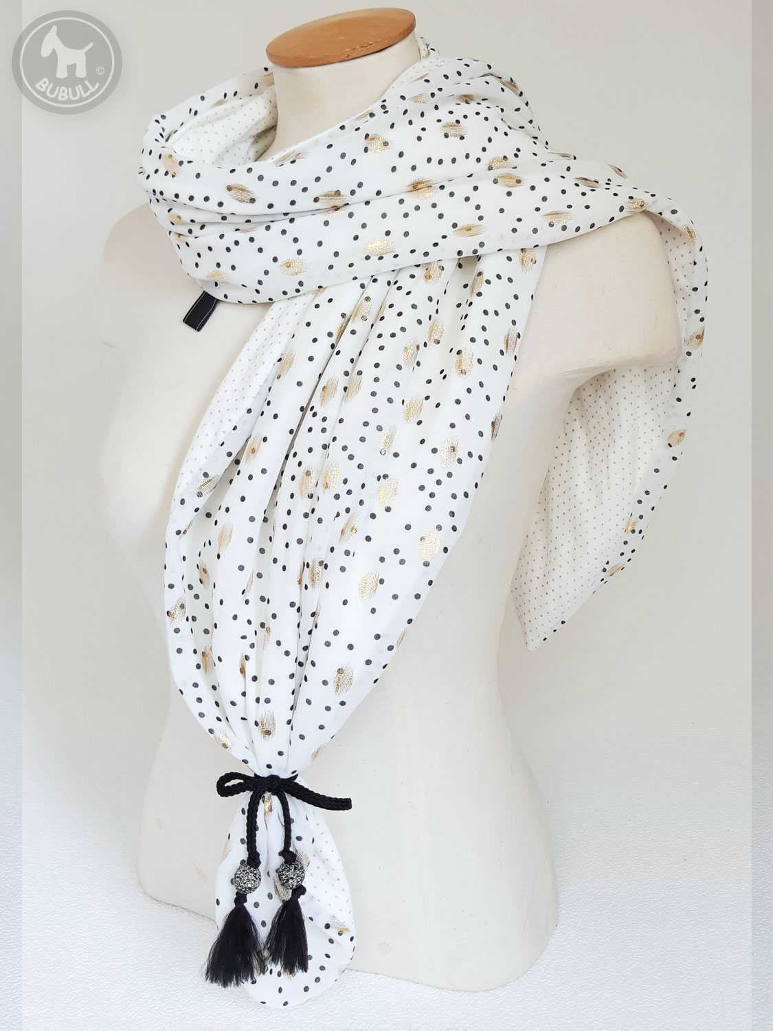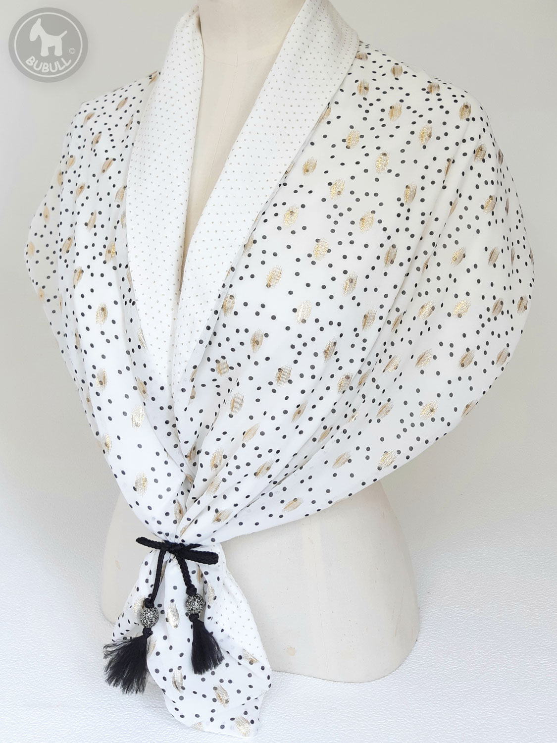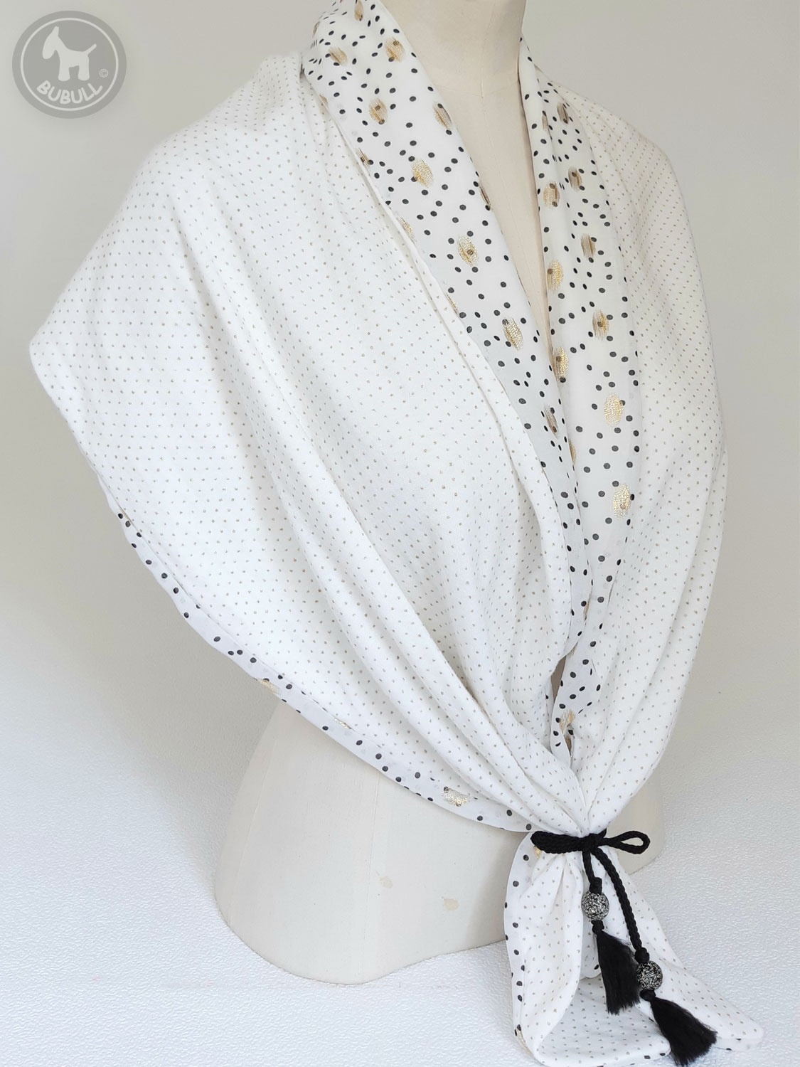 D’un côté un voile à motifs » pois » noirs,dorés.