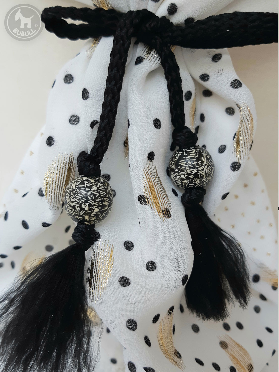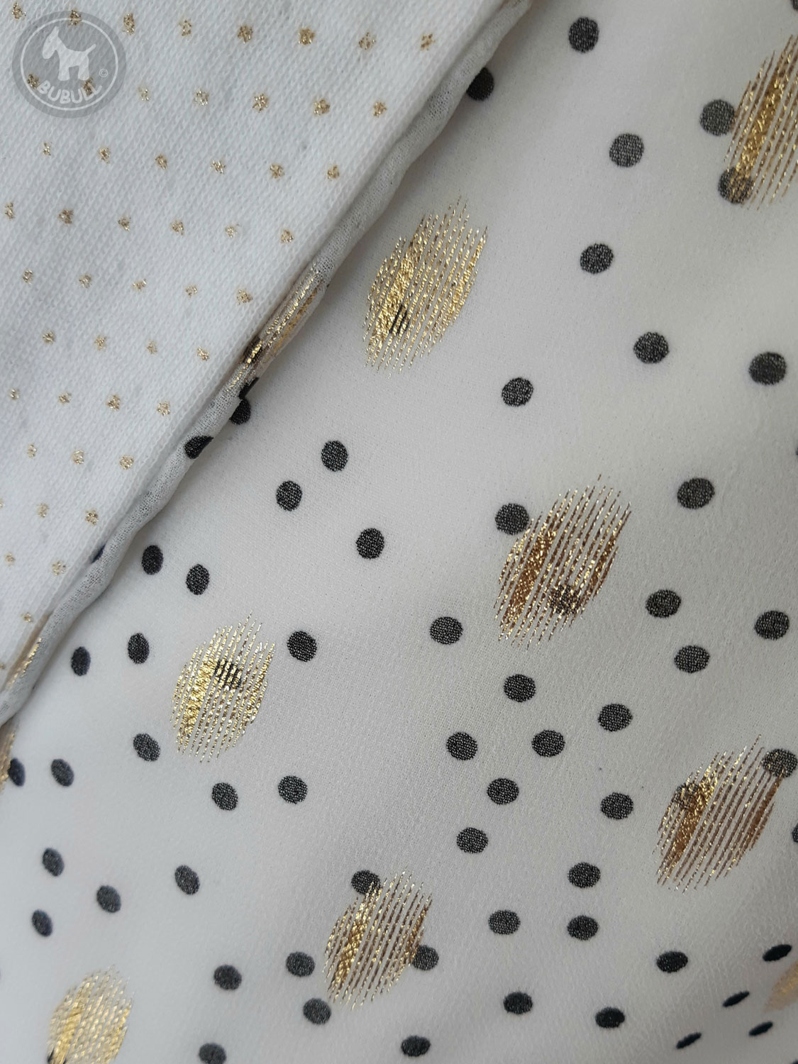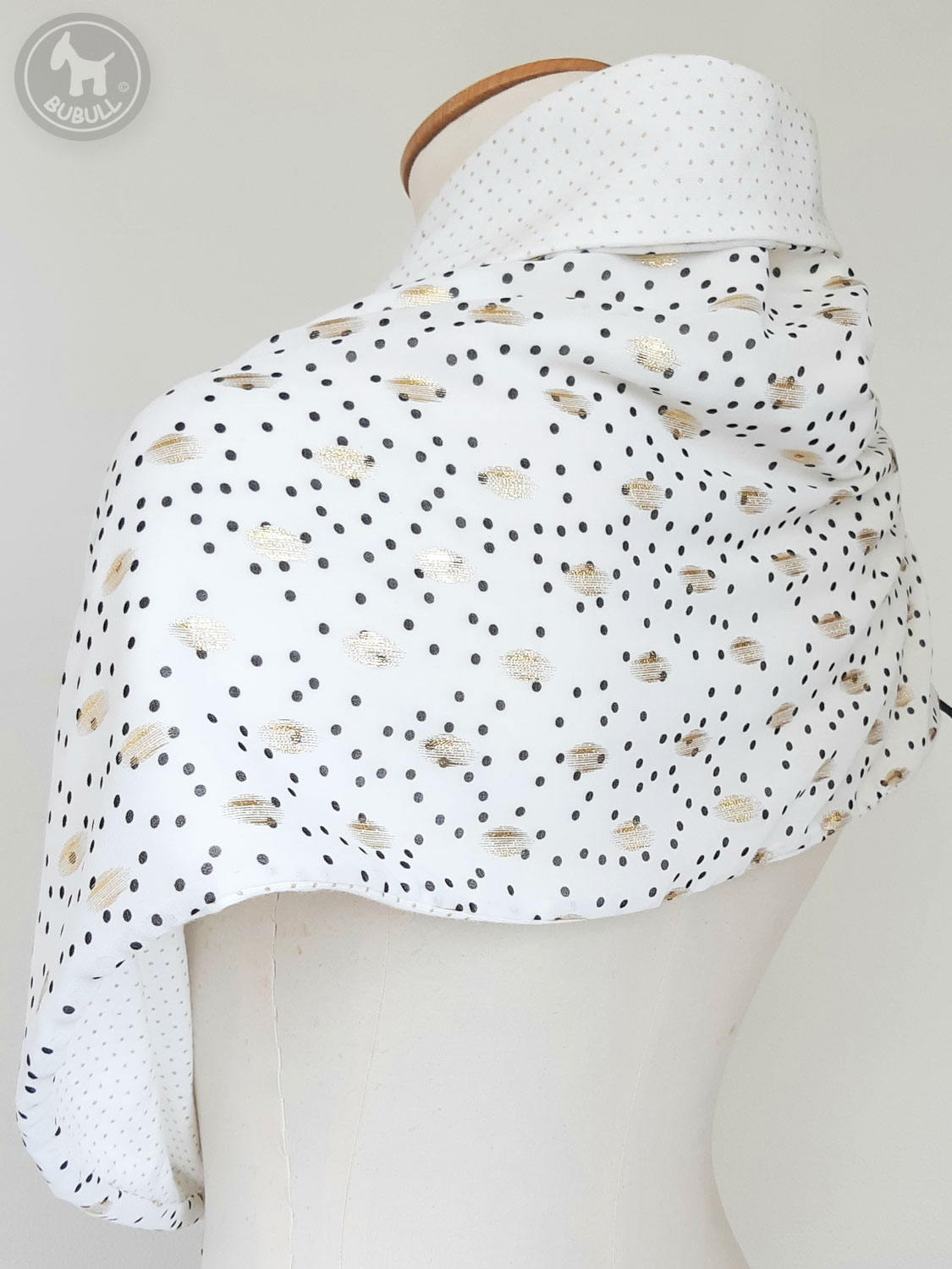 D’un côté un voile à motifs » pois » noirs,dorés.