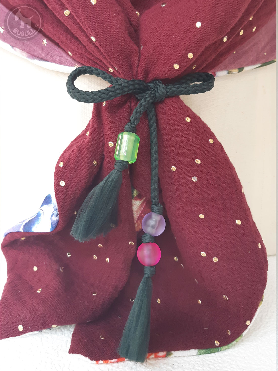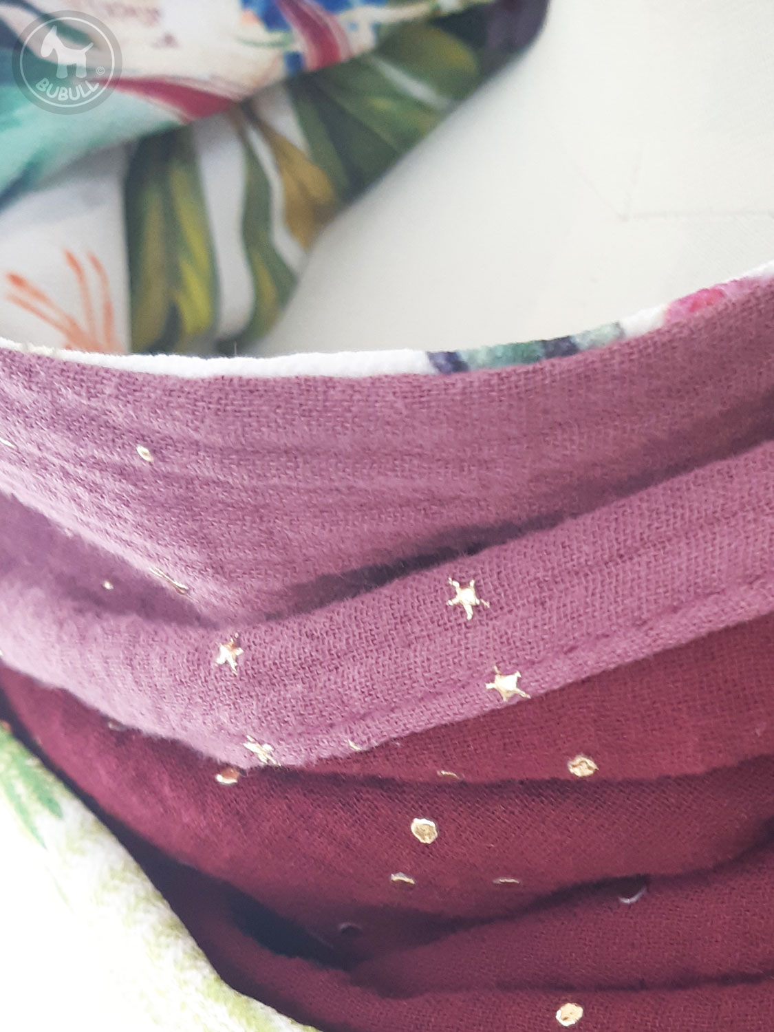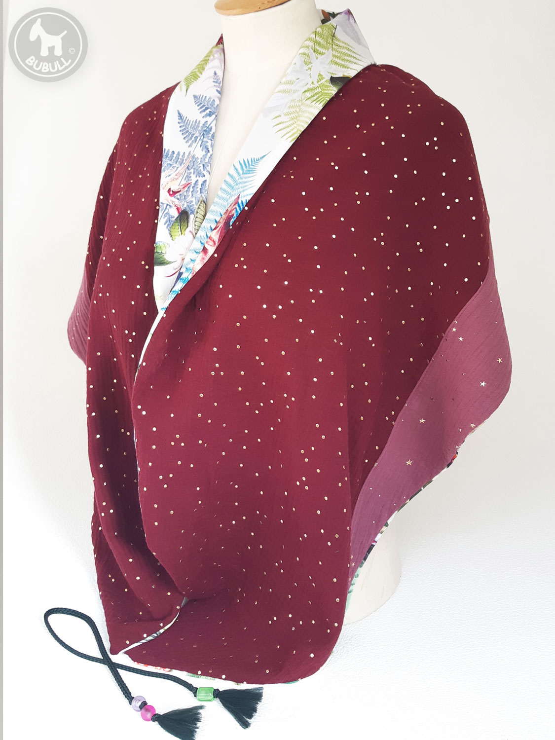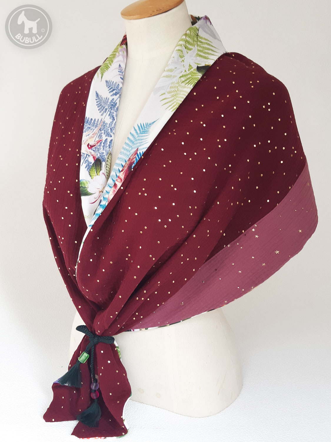 de l’autre une gaze de coton bordeaux et mauve à pois dorés.
